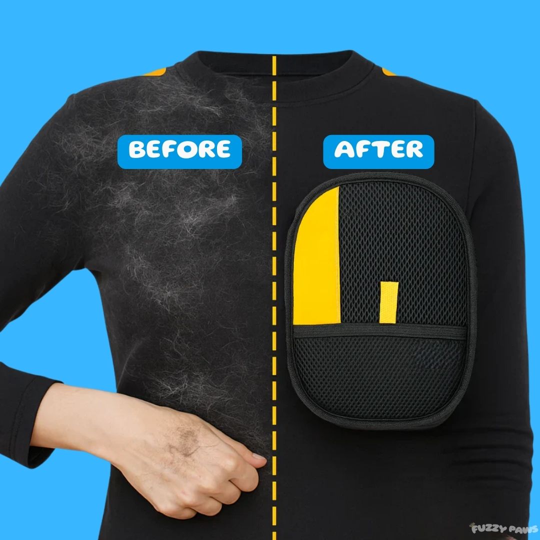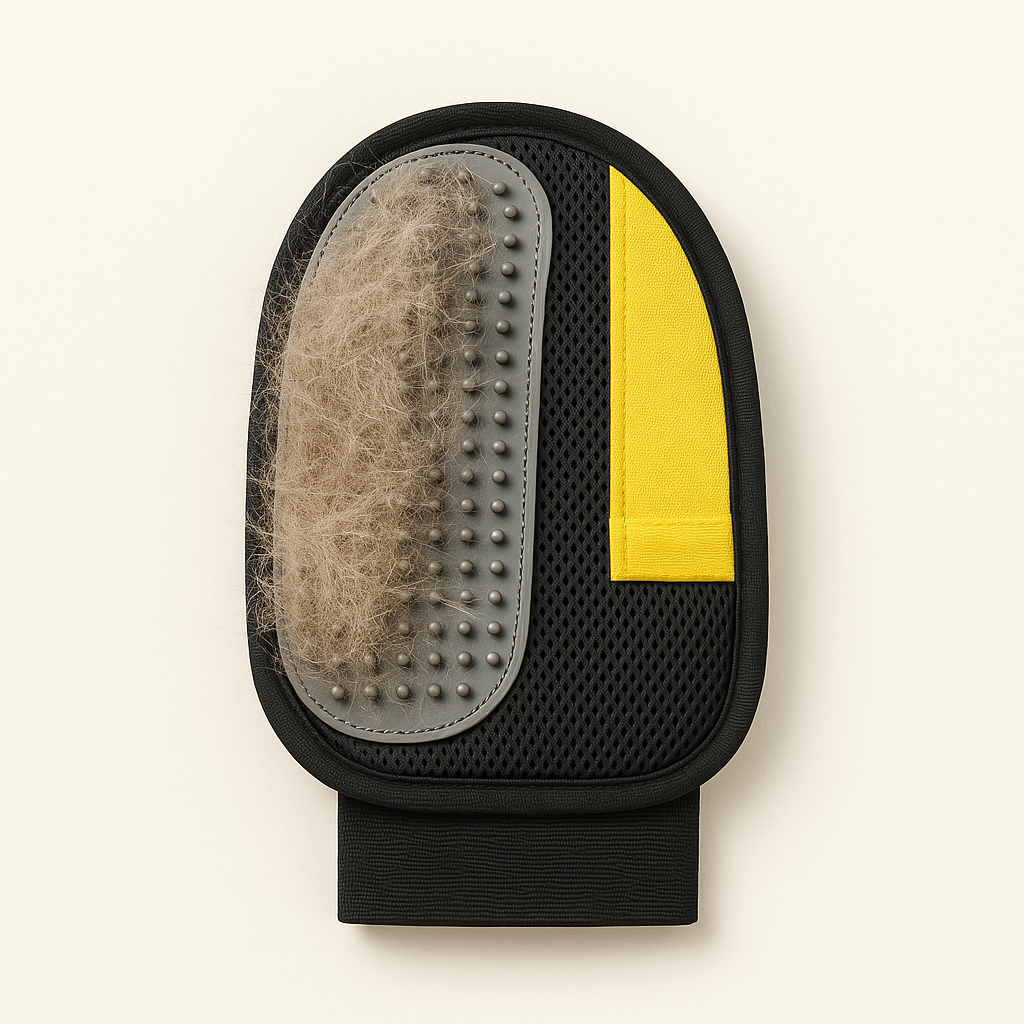 Reusable grooming glove designed to help remove loose pet hair from furniture, clothing, car seats, and pets. Features a textured rubber surface for lifting fur and dust, with a breathable mesh backing for comfort.
